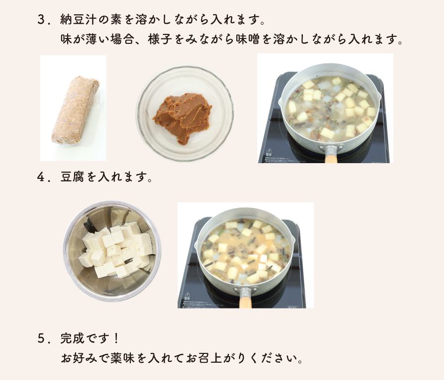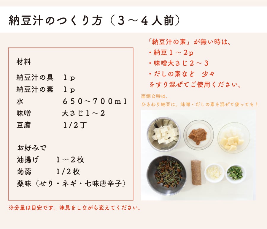 その他に、納豆・豆腐・お味噌・水をご用意頂ければ、大丈夫!