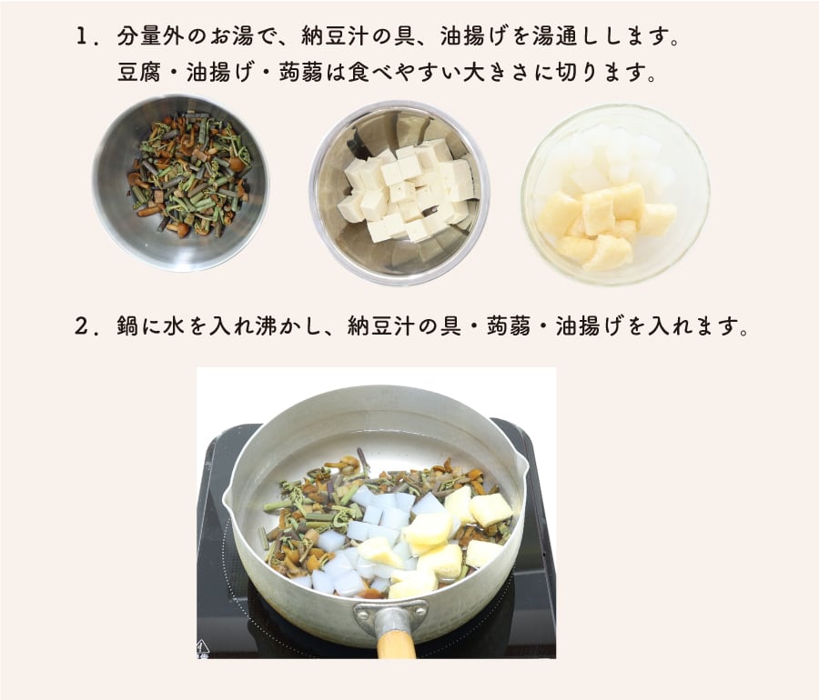 本場では、納豆と味噌を潰し混ぜ合わせたり、『納豆汁の素』各種を使いますが、お手軽に「ひきわり納豆」をそのままお鍋に入れて頂いても!